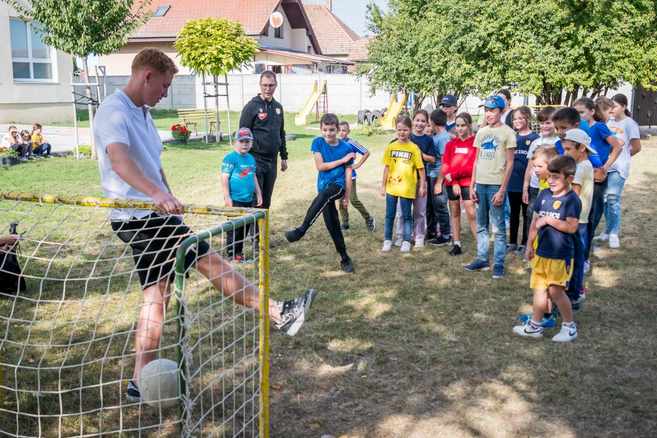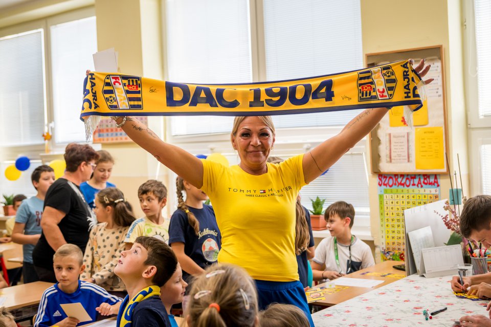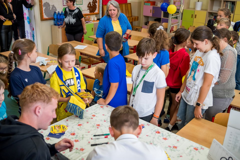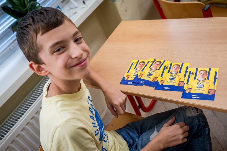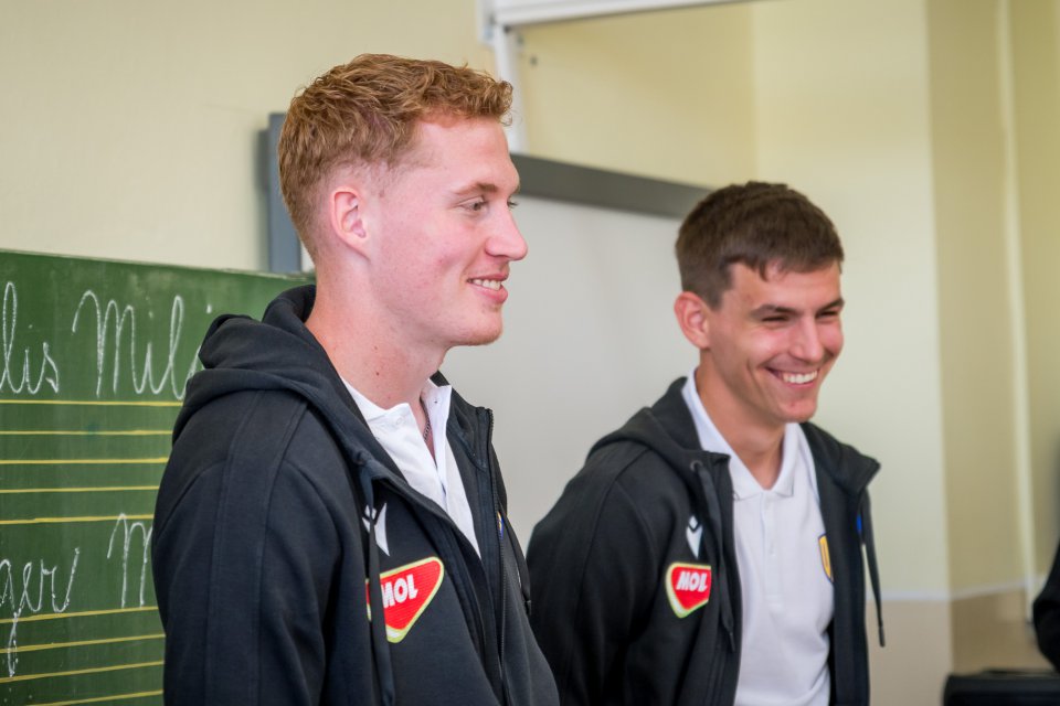 Márk Csinger a Milán Vitális zavítali vo štvrtok poobede do Čenkoviec, kde sa v rámci projektu Poďme spolu na DAC! stretli so žiakmi miestnej ZŠ s VJM. A my sa už teraz tešíme na bedeľu, kedy deti privítame v MOL Aréne na zápase proti Podbrezovej. Autor: Lelkes Ernő.
