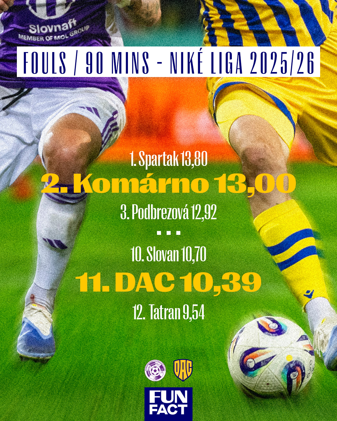 Hráči Komárna zaznamenali v priemere 13 faulov na zápas, čo je druhé najvyššie číslo po Trnave (13,80). DAC je priemerom 10,39 na zápas na opačnom konci poradia, druhý za Prešovom (9,54).