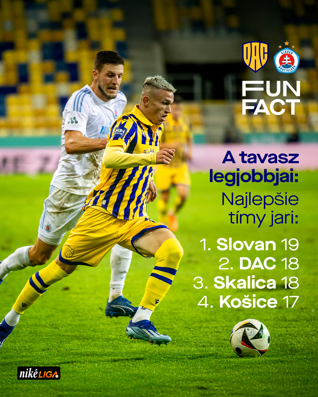 Zajtra večer bude MOL Aréna navyše svedkom súboja dvoch najlepších mužstiev jari. Slovan získal v desiatich tohtoročných kolách 19 bodov a DAC, ako jediný nezdolaný tím v roku 2025, ich má na konte 18. Rovnaké poradie platí aj v tabuľke nadstavby, kde po 6. kole vedie 14-bodový Slovan, DAC je druhý s 10 bodmi.