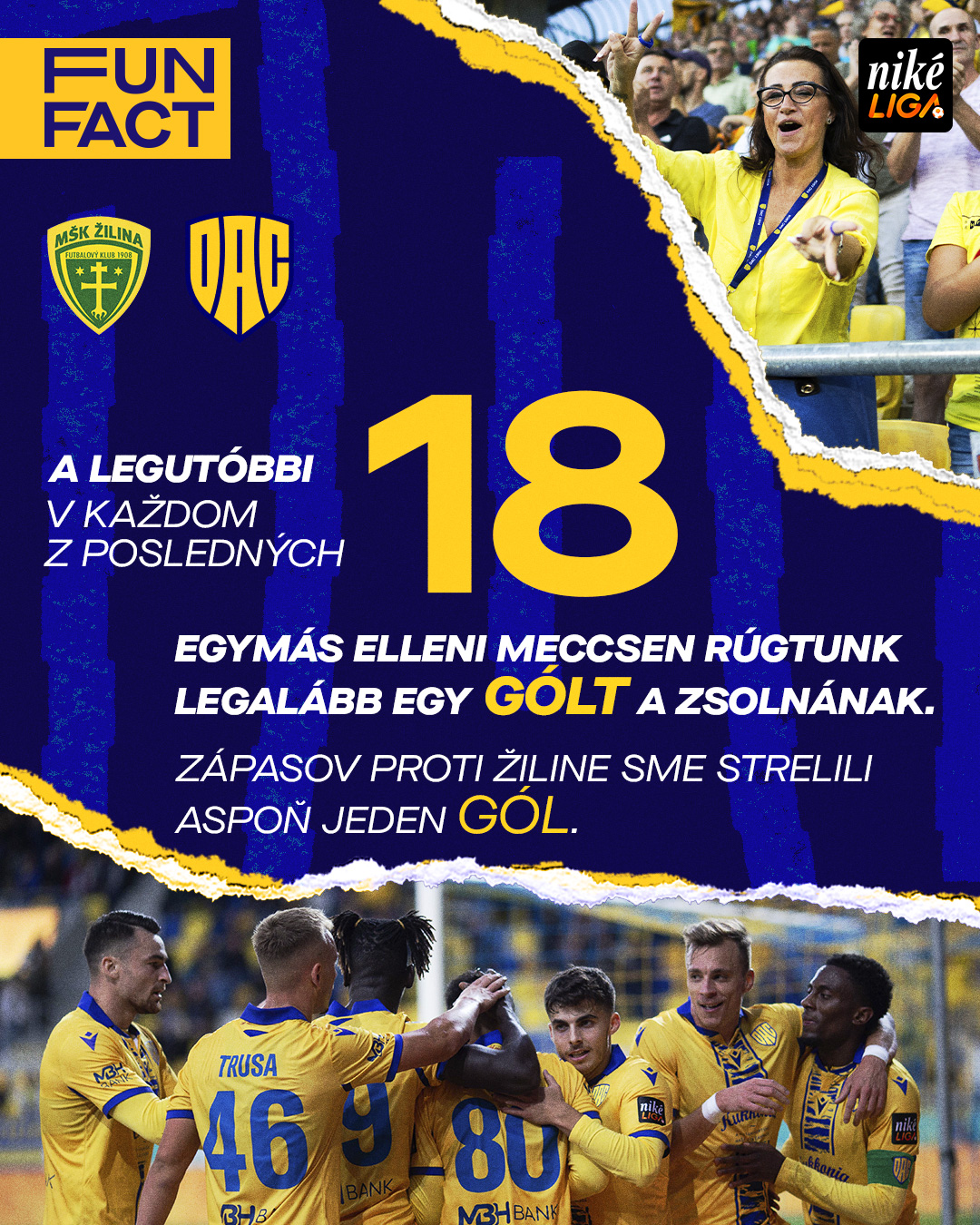 A Zsolna elleni legutóbbi 24 összecsapásunk mérlege 14-9-1, emellett sorozatban immár 18 meccsen szereztünk legalább egy gólt ellenük. Ilyen remek sorozatunk a Niké Liga egyetlen jelenlegi résztvevője ellen sincs. A 84 szerzett találat is rekord, semelyik más csapat ellen sem találtunk be ennyiszer az első ligában (a Nagyszombat következik 77-tel).