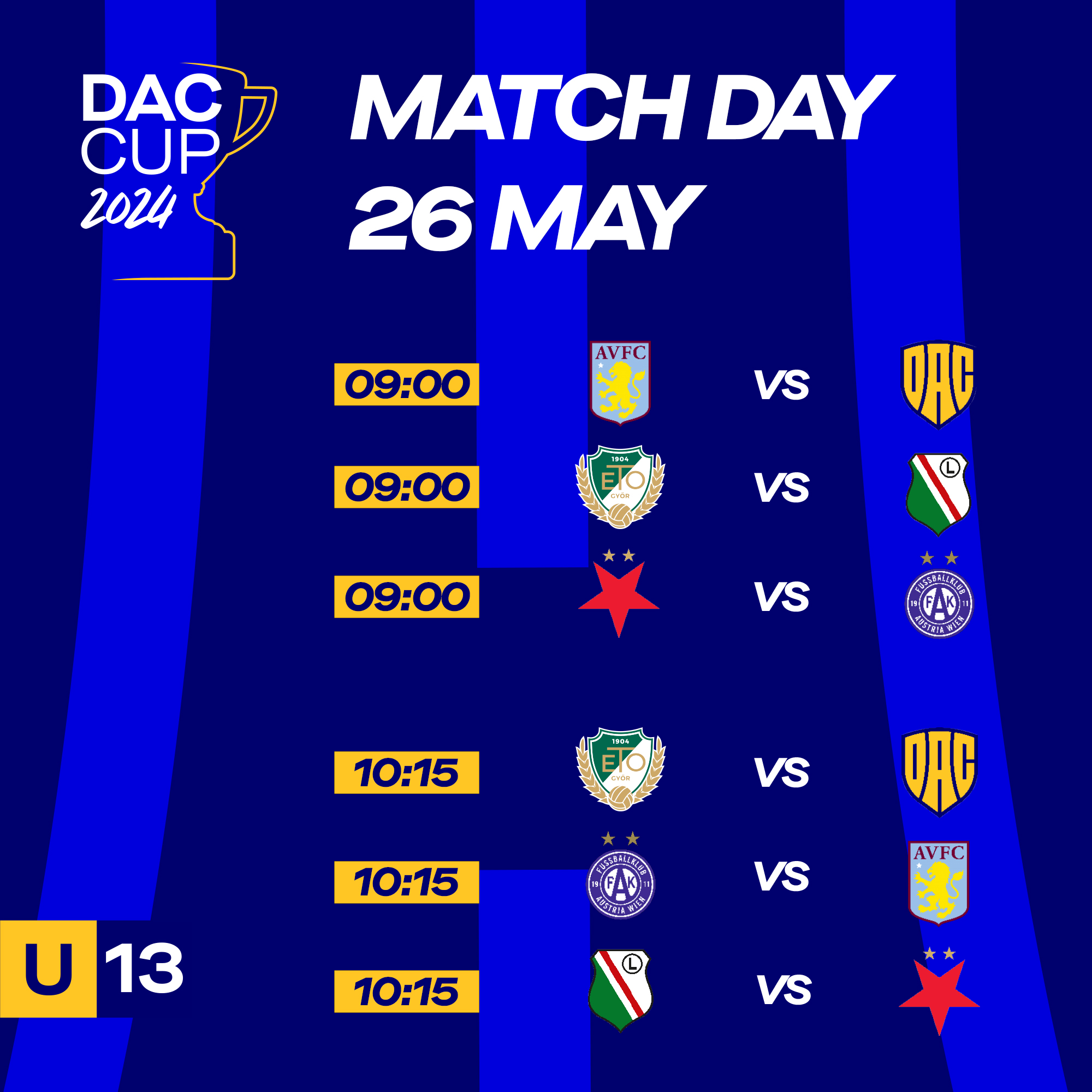 A II. DAC CUP U13 első napja után számos látványos akciót mutattak a játékosok, melyek tükröződnek az eredményeken is. Jelenlegi állás szerint az FK Austria Wien áll az első helyen, második a Legia Warszawa, harmadik pedig a DAC 1904. Holnap még 6 mérkőzést abszolválnak a növendékek, amely még bármilyen változást hozhat a dobogósok között.