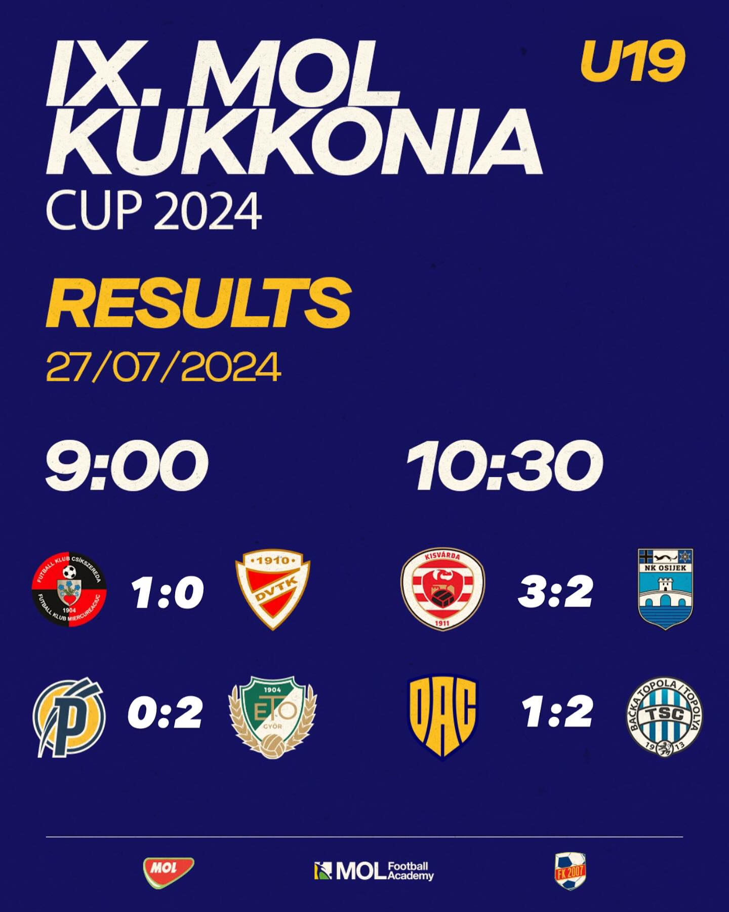 A MOL Kukkonia Kupa U19-es torna immár a kilencedik fejezetéhez érkezett. A szerb FK TSC TOPOLYA utánpótláscsapat nyerte meg a MOL Kukkonia Kupát. A tornán 8 kiváló csapat mérette meg magát, akik összesen 5 országból érkeztek – Magyarországról a Győri ETO a Puskás Akadémia, a Kisvárda és a DVTK, Erdélyből a Csíkszereda, Szerbiából a Topolya, Horvátországból pedig az Eszék utazott Dunaszerdahelyre.