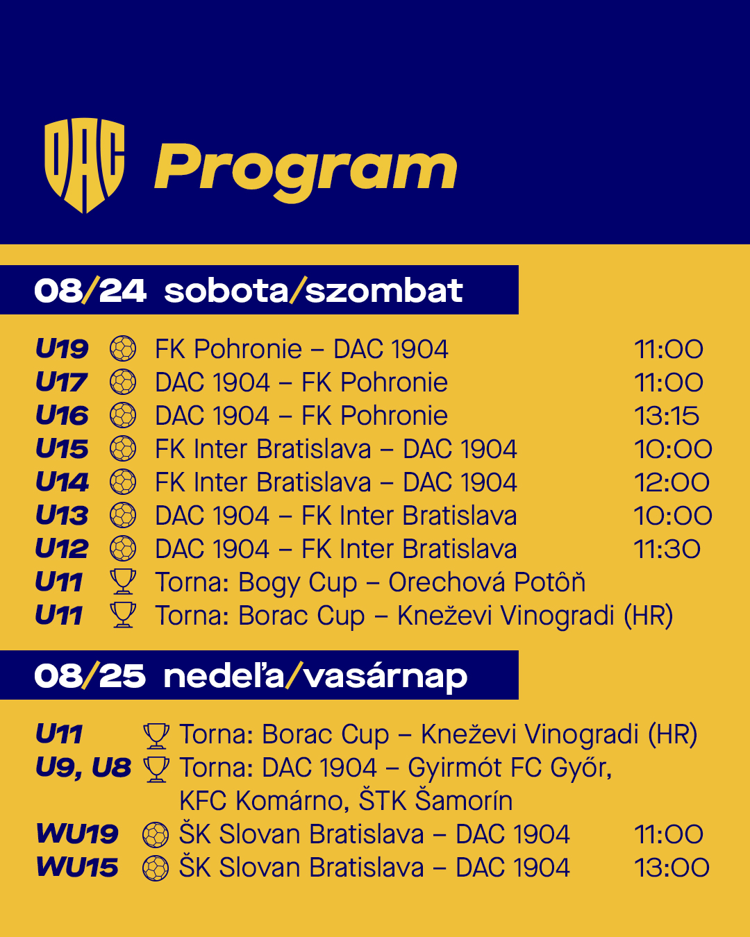 Szombaton, augusztus 24-én több korosztályos csapatunk mérkőzik meg hazai pályán az FK Pohronie és az Inter Bratislava csapataival. Az U11-esek, két különböző tornán, a Bogy Cup-on Dióspatonyban és a Borac Cup-on, Horvátországban vesznek részt. Vasárnap, augusztus 25-én folytatódnak a küzdelmek az U11-esek számára a horvátországi tornán, míg az U9-es és U8-as csapatok hazai tornán mérik össze erejüket Gyirmót, Komárom és Somorja növendékeivel. A női utánpótlásban a WU19 és WU15 a pozsonyi Slovan Bratislava csapatai ellen játszanak. Ezen a hétvégén is tehát komoly kihívások és izgalmas mérkőzések várnak akadémistáinkra. Mindenkit szeretettel várunk a lelátókra!