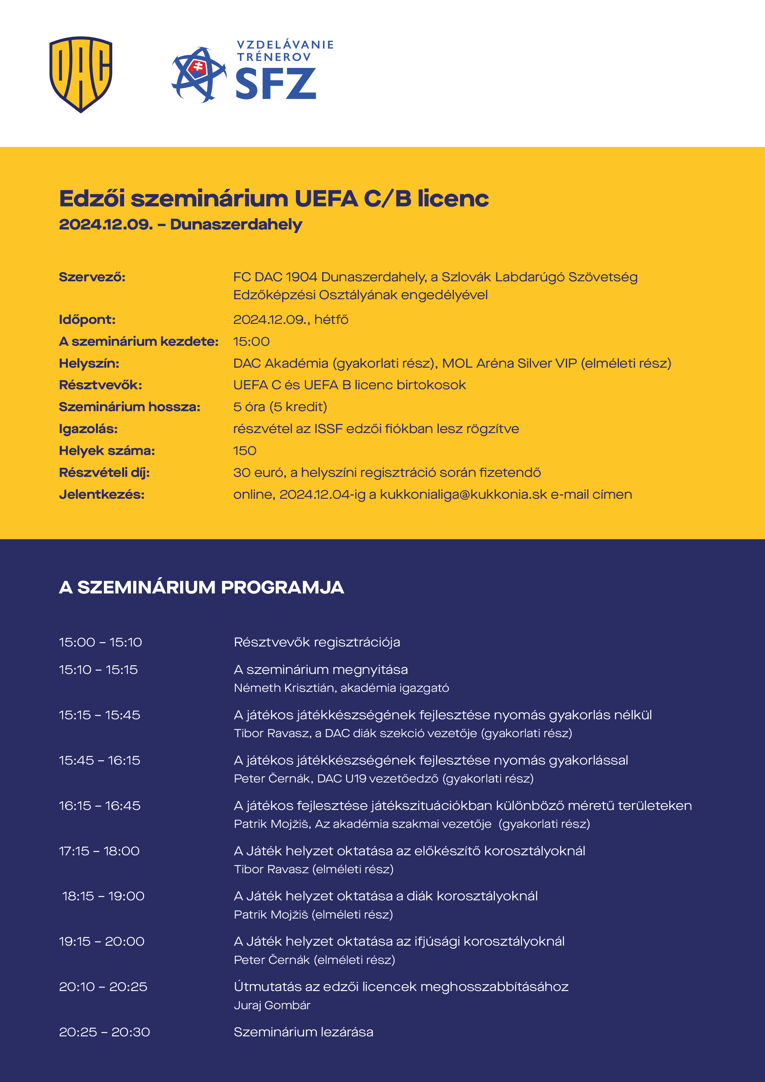 DAC 1904 FOOTBALL ACADEMY szeretettel várja az érdeklődőket a 2024.9.12. megtartandó edző képzésre. Az edző képzés a szlovák labdaróugó szövetséggel közreműködve jön létre, így az UEFA C és az UEFA B edzői képesítéssel rendelkezők a részvételért 5 kreditet kapnak, amit a lecinsz meghosszabításnál felhasználhatnak. A résztvevők ISSF kontójáában automatikusan beírásra kerül az 5 kredit pontszám. Az előadók az akadémiánk edzői lesznek. A résztvevők praktikus gyakorlatokat láthatnak a pályán és az elméleti előadásokon keresztül szélesíthetik szakmai tudásukat az ifjóusági futballal kapcsolatosan. Igény szerint bebiztosítjuk a fordítást is szlová nyelvről magyarra