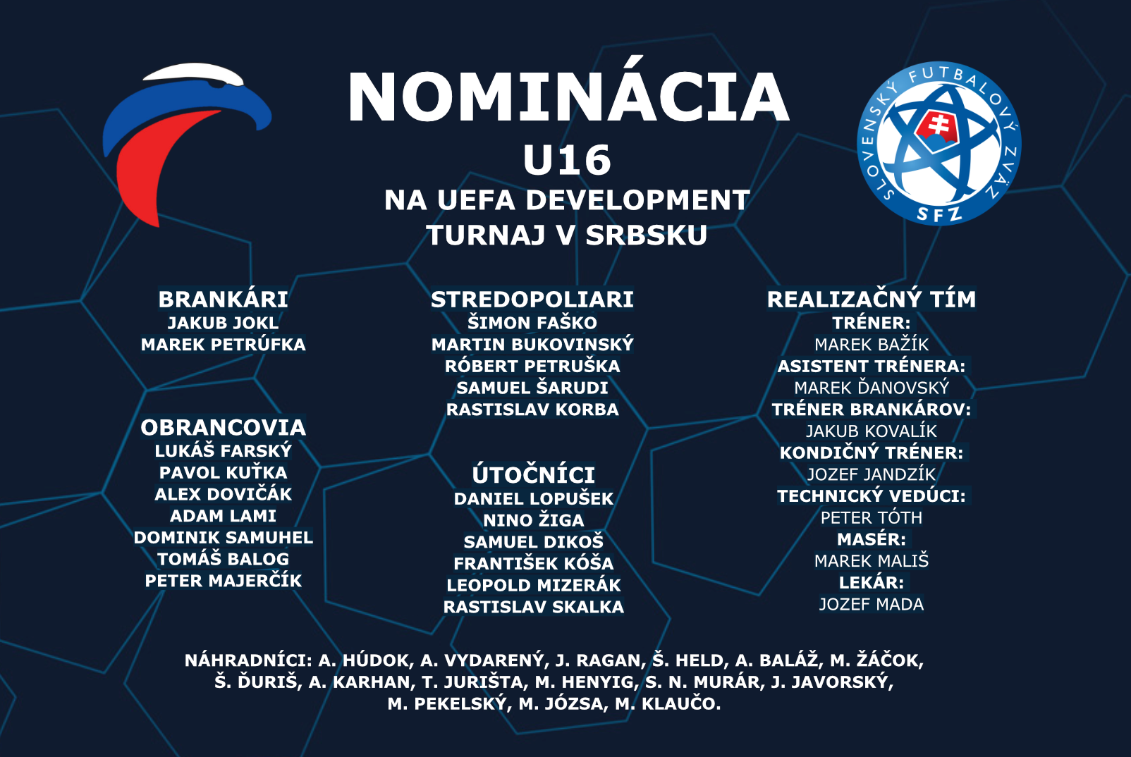A szlovák U16 válogatott edzője, Marek Baík is kijelölte azt a 20 fős keretet, akik Szerbiába utaznak az "UEFA Development" tornára. A játékosok és a stáb május 3-án, kedden találkoznak a somorjai X-Bionic Sphere üdülőhelyen. A szerbiai UEFA tornán három mérkőzés vár a csapatunkra, méghozzá Magyarországgal, Finnországgal és a hazai szerb válogatottal.