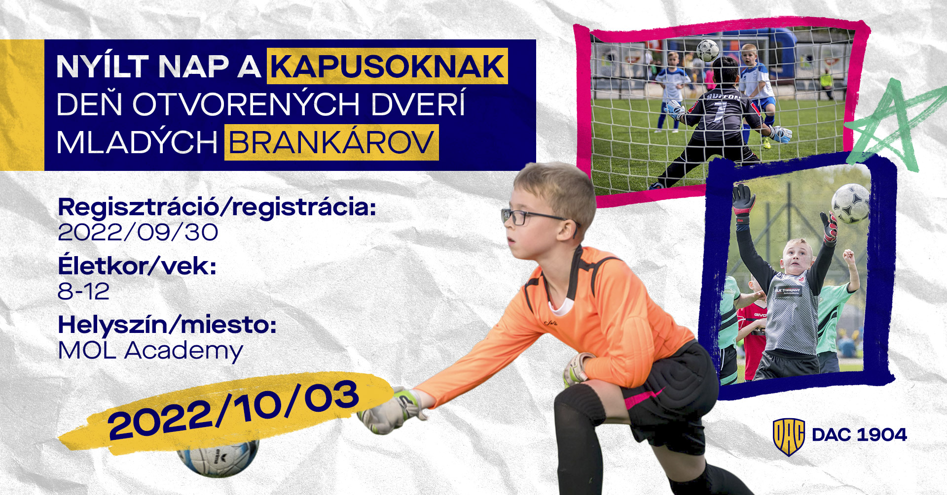 Ezt a tájékoztatót azok figyelmébe ajánljuk, akik az elsődleges regisztráció keretein belül jelentkeztek az akadémiánk által rendezett NYÍLT NAPRA, ahol a kapusnövendékek találkozhatnak a DAC kapusedzőivel, akik a helyszínen majd további útbaigazítással látják el az oda érkezőket.