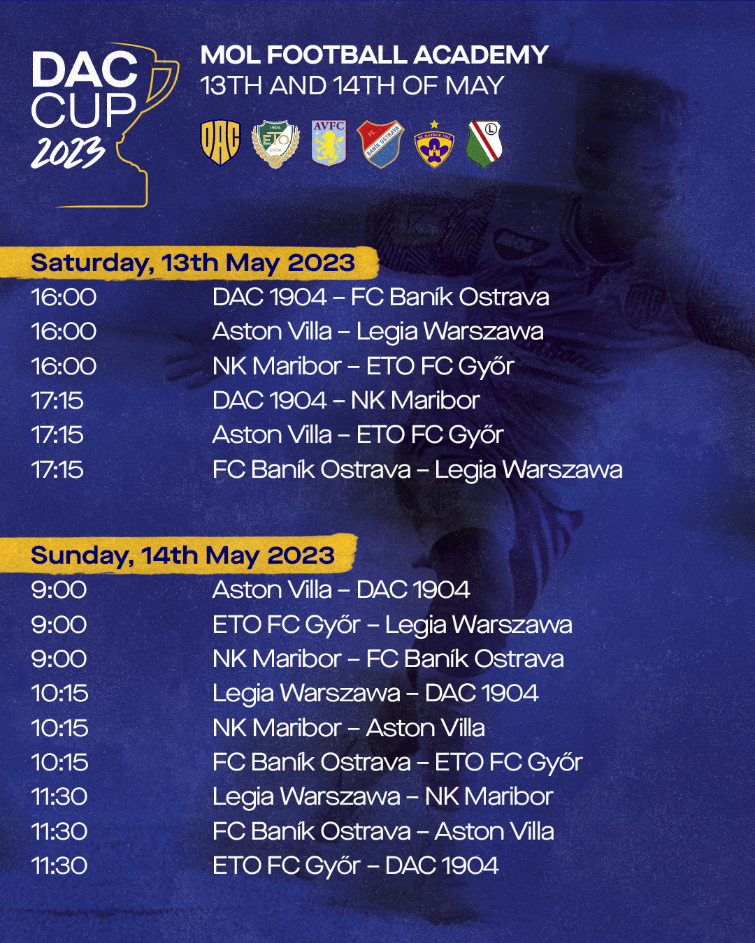 Újabb izgalmas focitorna helyszíne lesz az előttünk álló hétvégén a MOL Akadémia, ahová ezúttal öt idegen országból érkeznek csapatok az U13-as korosztályból. A május 13-án szombaton, és május 14-én vasárnap megrendezett eseményen a DAC 1904 mellett a cseh FC Baník Ostrava, az angol Aston Villa, a lengyel Legia Warszawa, a szlovén NK Maribor és a magyar ETO FC Győr csapata szerepel.