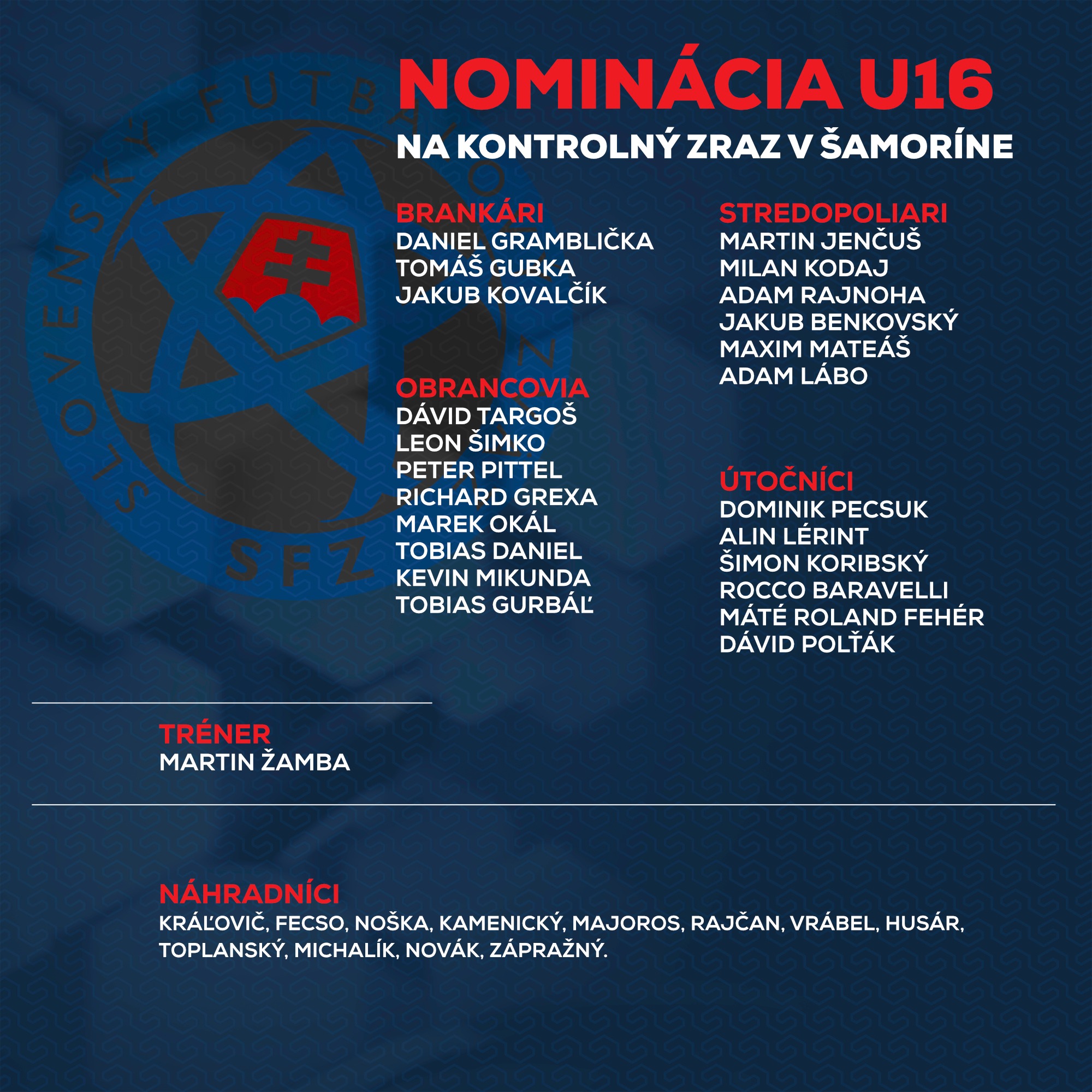 Az U16-os válogatott edzője, Martin amba és az U15-ös válogatott edzője, Marek Baík kijelölte a csapatokat a somorjai edzőtáborra.