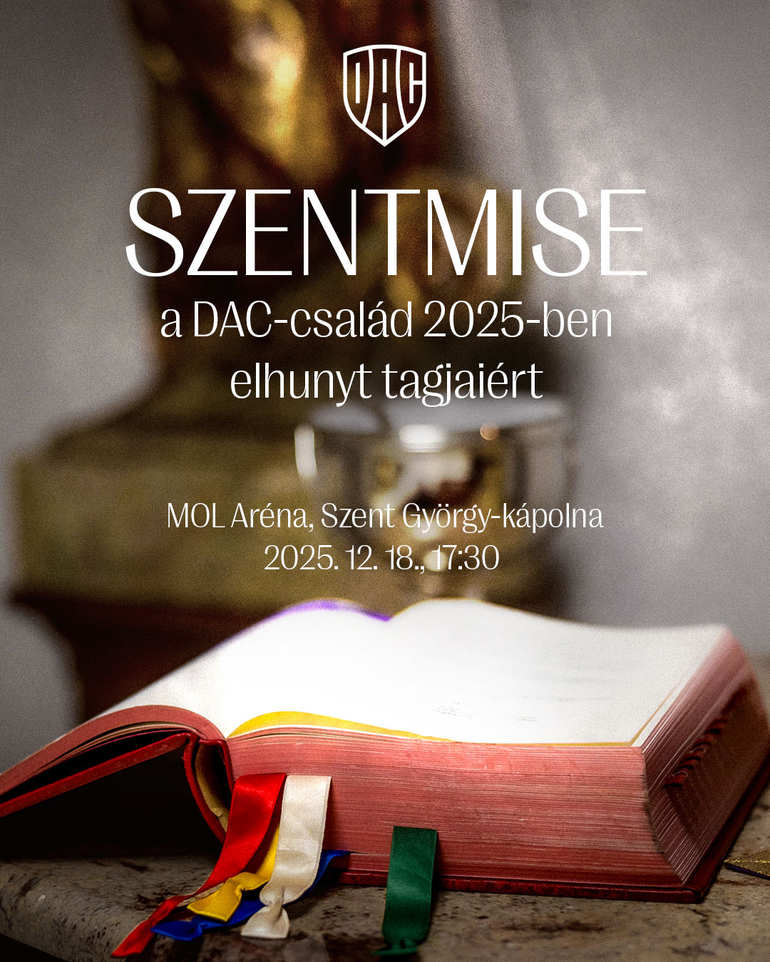 Katolikus szentmise a DAC-család 2025-ben elhunyt tagjaiért. Az esemény nyilvános, helyszín a MOL Aréna Szent György-kápolnája.