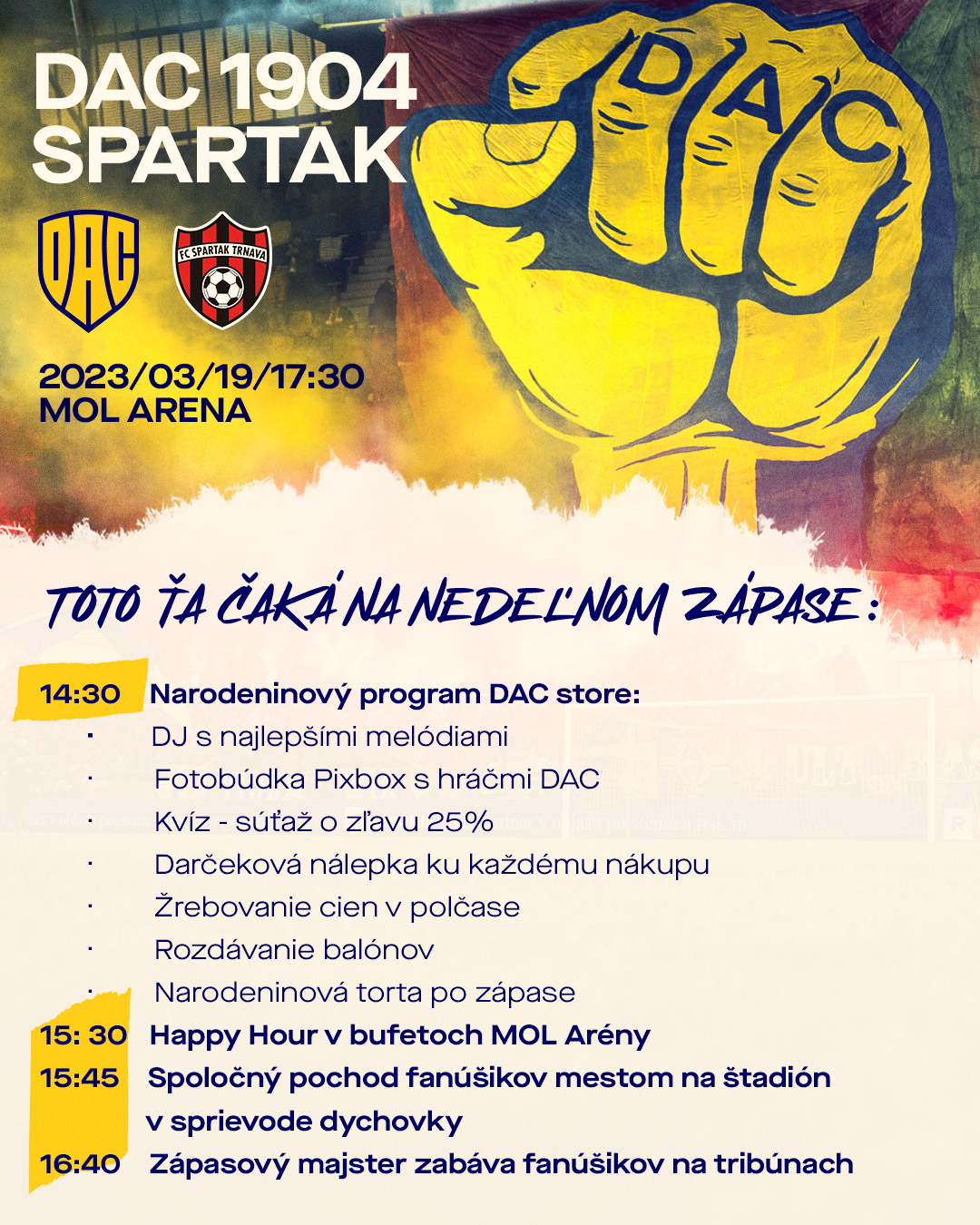 Ani príchod na tribúnu neprebehne v úplnom tichu, pretože z ihriska bude divákov zabávať Tamás Bernáth, herec Jókaiho divadla v Komárne. Pred zápasom aj po ňom sa oplatí nazrieť do DAC store, ktoré oslavuje 5. narodeniny a kde sme pre fanúšikov pripravili bohatý program vrátane súťaže o cenné výhry. Víťazov vyžrebujeme v polčasovej prestávke. Po derby zase spolu s našimi hráčmi a majiteľom rozkrojíme v DAC store narodeninovú tortu.