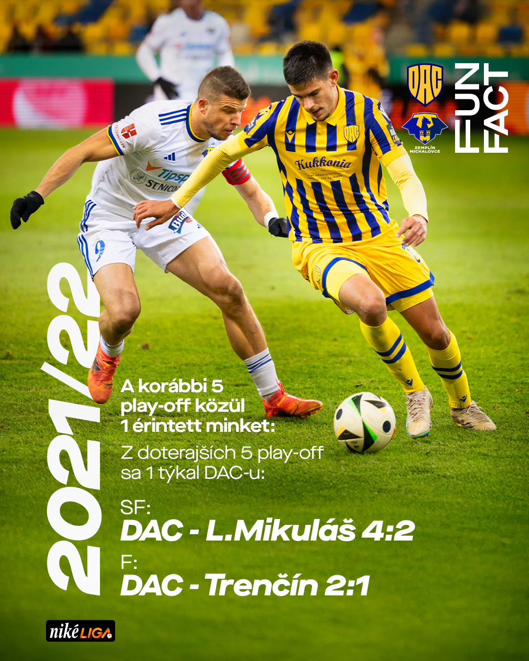 V ôsmej sezóne pri súčasnom súťažnom modely Niké ligy sa šiestykrát uskutoční play-off o poslednú európsku miestenku. DAC-u sa doteraz týkalo jediný raz, a to na jar 2022. V semifinále sme vtedy porazili Liptovský Mikuláš 4:2 a vo finále Trenčín 2:1. Aj vtedy sme hrali dvakrát doma.