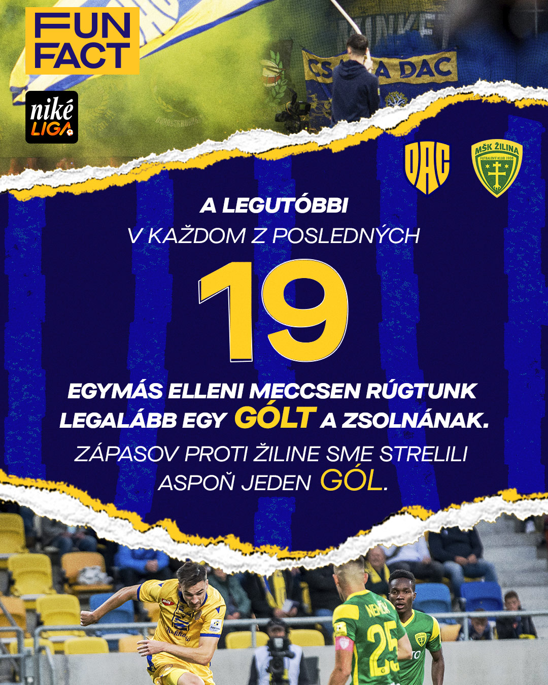 Doma to bude 35. vzájomný zápas, v tom úplne prvom, v septembri 1985, sme strelili náš premiérový gól (Juraj Majoros) a dosiahli vôbec prvé víťazstvo v 1. lige. Posledných 5 stretnutí odohraných v MOL Aréne proti Žiline sme vyhrali.
